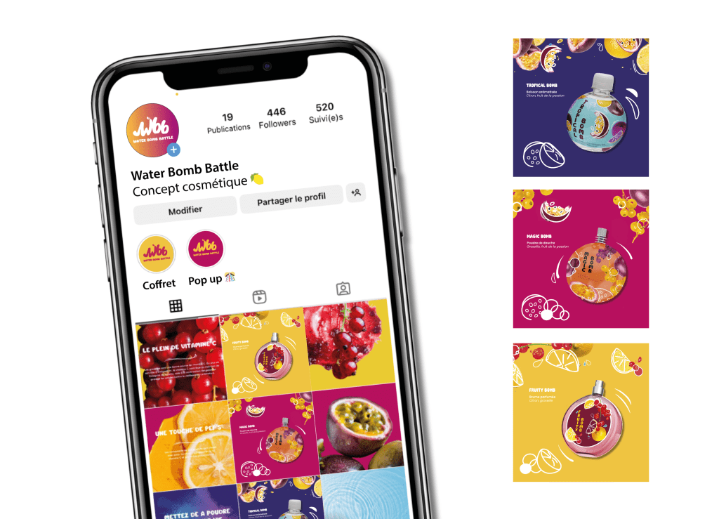 Water Bomb Battle est un projet collaboratif entre les écoles ISPCA et Gobelins qui a pour objectif de développer un coffret cosmétique pour l’été 2024, autour du thème de la bataille d’eau et des fruits. Le coffret comprend une brume de parfum, une poudre de douche et une boisson aromatisée, pour compléter l’expérience sensorielle. Pour promouvoir ce coffret, la marque lance une campagne de communication et organise un événement pop-up immersif, visant à maximiser la visibilité de son coffret et ainsi accroître la notoriété de son identité et de ses produits.